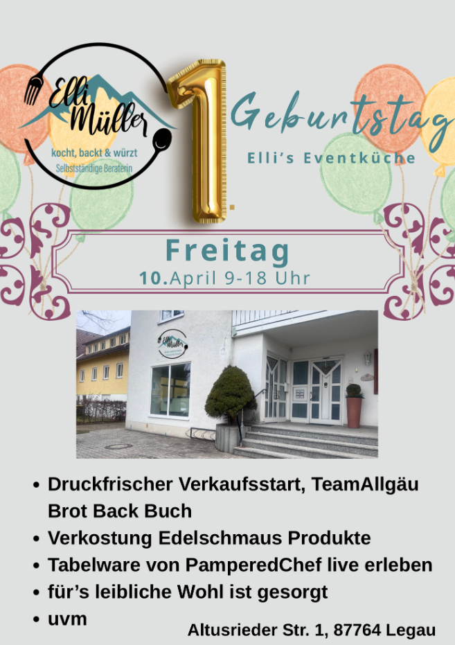 Ein Ort, an dem sich Genuss und Begegnung verbinden: Der 1. Geburtstag bei Elli’s Eventküche in Legau wird am Freitag, 10. April 2026, von 9:00 bis 18:00 Uhr gefeiert. Die Veranstaltung lädt dazu ein, einen Tag rund um Kulinarik, Austausch und neue Ideen zu erleben – in einer Atmosphäre, die bewusst offen und persönlich gehalten ist. ☕🥐🎉