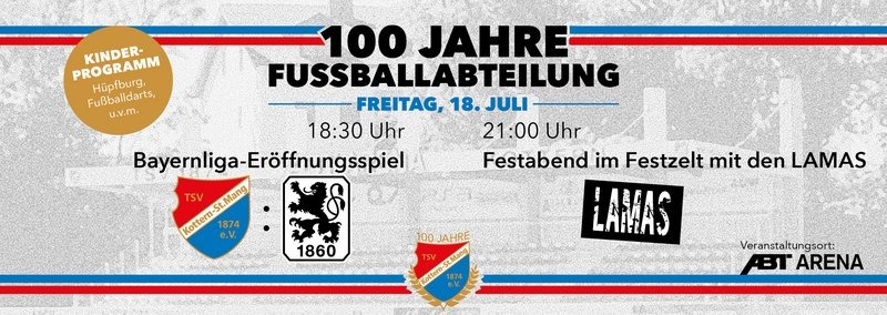 Der TSV Kottern-St. Mang feiert vom 18. bis 20. Juli 2025 das 100-jährige Bestehen seiner Fußballabteilung mit einem vielseitigen Programm in der ABT Arena in Durach. Geplant ist ein dreitägiges Fest für Fußballbegeisterte, Familien und Freunde des Vereins – mit sportlichen Höhepunkten, musikalischer Begleitung und festlicher Atmosphäre.