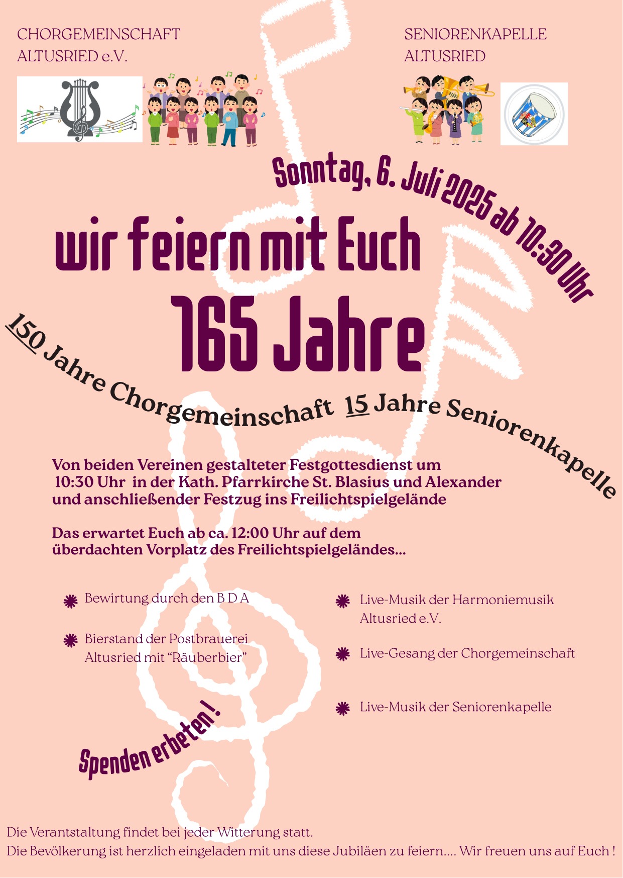 📍 Altusried feiert doppelt musikalisch: Die Chorgemeinschaft Altusried e. V. wird 150 Jahre alt, die Seniorenkapelle Altusried feiert ihr 15-jähriges Bestehen. Am Sonntag, 6. Juli 2025 wird dieses gemeinsame Jubiläum mit einem festlichen Gottesdienst und einem musikalischen Programm auf dem Freilichtspielgelände gefeiert.