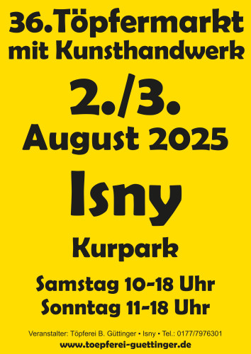 Einer der traditionsreichsten Töpfermärkte im Allgäu lädt am ersten Augustwochenende in den Kurpark von Isny ein. Über 90 Aussteller präsentieren ihre handgefertigten Werke – von kunstvoller Keramik und Glasbläserkunst über Holz- und Metallarbeiten bis hin zu feinen Seifen, Schmuckunikaten und filigranen Drechselarbeiten. Auch ausgefallene Windräder für den Garten, edle Lederwaren und handgefertigte Kinderbücher gehören zum breiten Angebot dieses Marktes.
