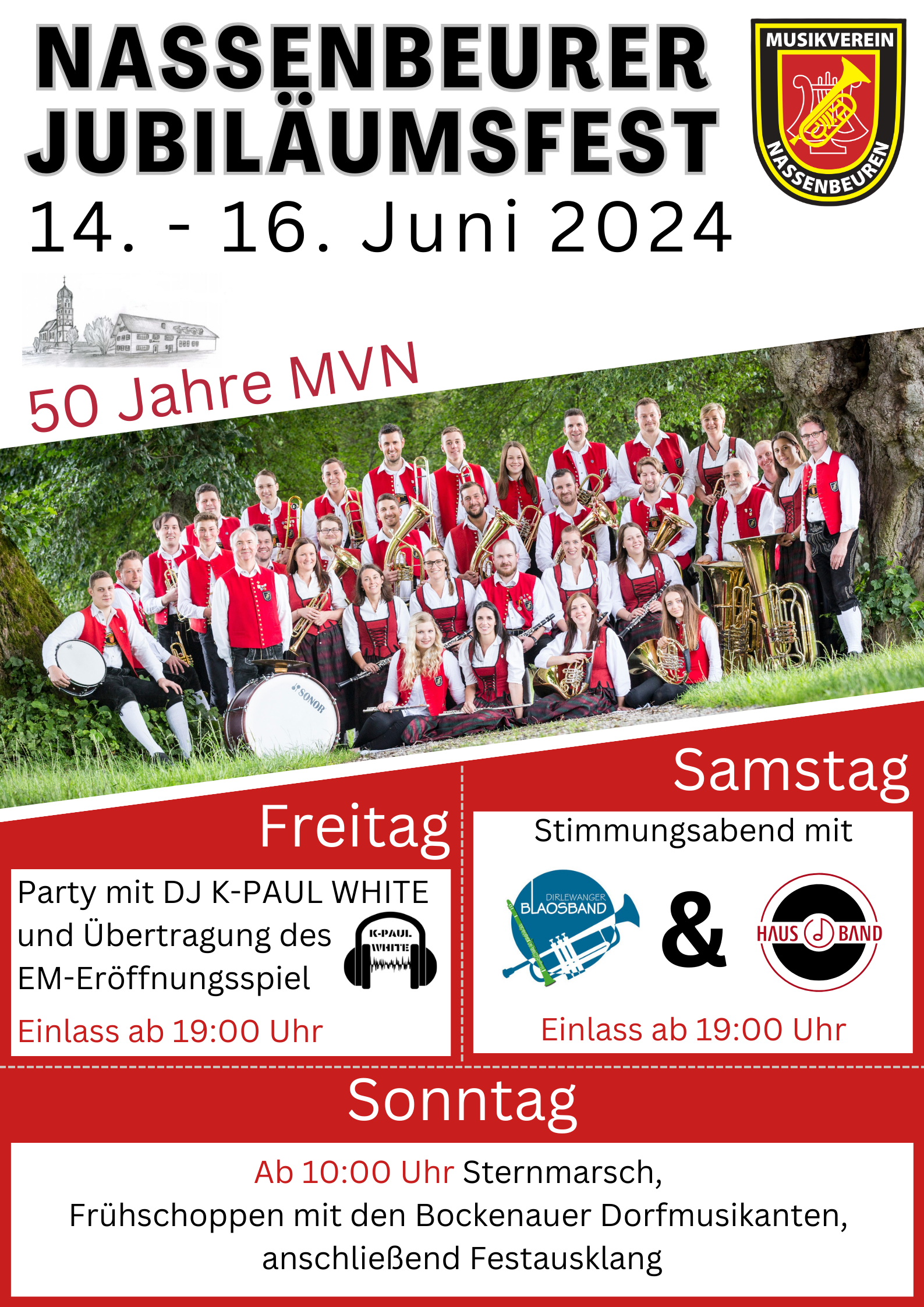 Vom 14. bis 16. Juni 2024 feiert der Musikverein Nassenbeuren sein 50-jähriges Jubiläum mit einem großen Fest.