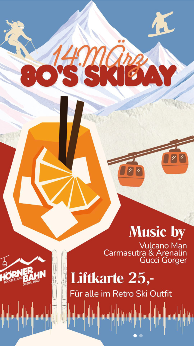 Die Hörnerbahn Bolsterlang liegt im Oberallgäu und gehört zu den bekannten Wintersportgebieten der Region. Von der Bergstation eröffnet sich ein weiter Blick über die Allgäuer Alpen. Gerade diese Kulisse verleiht dem Event seinen eigenen Charakter: Retro-Musik, schneebedeckte Gipfel und die lockere Atmosphäre eines Skitags verschmelzen zu einer Veranstaltung, die Wintersport mit Festivalstimmung verbindet. 🏔️❄️🌞