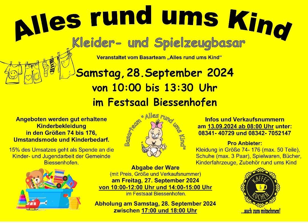 Am Samstag, den 28. September 2024, findet im Festsaal Biessenhofen der Alles rund ums Kind Kleider- und Spielzeugbasar statt. Die Veranstaltung beginnt um 10:00 Uhr und endet um 13:30 Uhr. Angeboten werden gut erhaltene Kinderbekleidung in den Größen 74 bis 176, Umstandsmode sowie diverse Artikel für den Kinderbedarf.