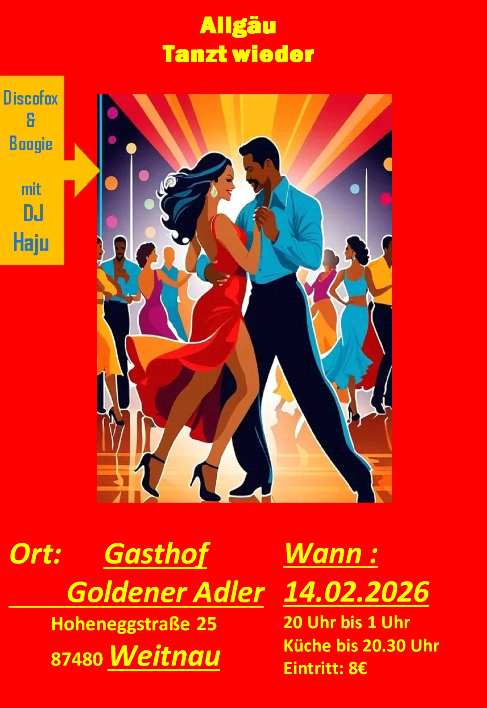 Allgäu tanzt wieder im Gasthof Goldener Adler Weitnau steht unter dem musikalischen Vorzeichen von Discofox und Boogie. DJ Haju gestaltet den Abend mit einem Repertoire, das klare Rhythmen und eingängige Taktfolgen bevorzugt 🎶✨. Diese Musikstile bringen eine Dynamik mit, die sowohl erfahrene Tänzerinnen und Tänzer als auch Menschen anspricht, die sich einfach vom Takt führen lassen möchten. Der Gasthof mit seiner traditionellen Architektur bietet dafür einen intimen Rahmen: Holz, warmes Licht und eine Saalstruktur, die Nähe zulässt und gleichzeitig genügend Raum für elegante Drehungen bietet.