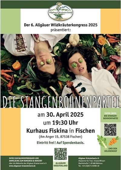 Eröffnet wird der Allgäuer Wildkräuterkongress in Fischen im Allgäu am Mittwoch, den 30. April 2025 mit der Kunstausstellung „Wildwuchs“ um 18:00 Uhr in der Fiskina. Direkt im Anschluss findet um 19:30 Uhr ein Konzert der Formation Stangenbohnenpartei statt – beide Programmpunkte sind öffentlich zugänglich und der Eintritt erfolgt auf Spendenbasis.