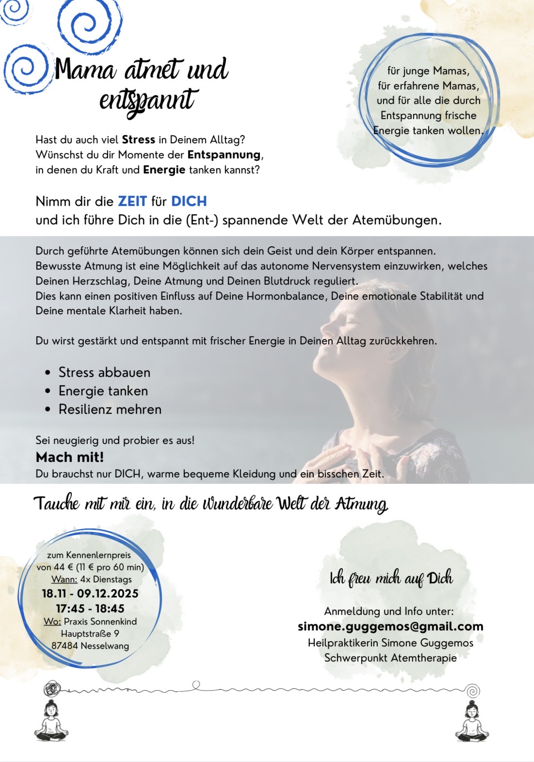 Geführt wird der Kurs von Simone Guggemos, Heilpraktikerin mit dem Schwerpunkt Atemtherapie. Im Mittelpunkt stehen Atemlenkung, Körperwahrnehmung und kurze, geführte Ruhephasen. Das Setting ist bewusst reduziert: wenig Requisiten, klarer Ablauf, präzise Anleitung. Der Effekt entfaltet sich über das Einfache – Rhythmus, Atemtiefe, wiederkehrende Sequenzen. ✨🌿💙