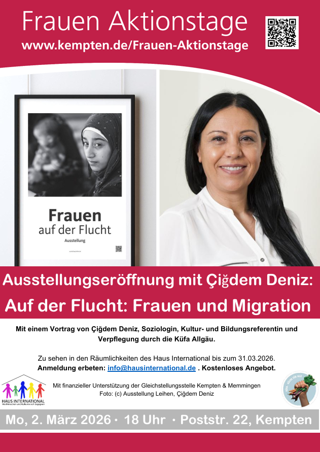 Ab dem zweiten Absatz rückt der inhaltliche Rahmen klar in den Fokus. Die Ausstellungseröffnung findet am Montag, 2. März 2026, um 18 Uhr im Haus International in Kempten statt. Sie ist Teil der Frauenaktionstage und setzt bewusst einen thematischen Schwerpunkt auf Frauen und Migration. Zur Eröffnung spricht Çiğdem Deniz, Soziologin sowie Kultur- und Bildungsreferentin, die sich seit vielen Jahren mit den Themen Flucht, Integration, Bildung und gesellschaftliche Teilhabe beschäftigt.
