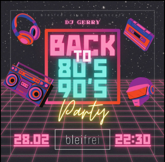 Neonfarben, Rastergrafiken und ein Beat, der sofort Erinnerungen weckt: Bei Back to 80s & 90s im bleifrei Club verschmelzen zwei Jahrzehnte Popkultur zu einer durchgetanzten Nacht 🕺🎧. Am 28. Februar öffnet der Club um 22:30 Uhr seine Türen für eine Zeitreise zwischen Synthesizern, Mixtapes und Clubklassikern. DJ Gerry übernimmt die musikalische Steuerung und führt durch Hits, die Generationen geprägt haben.