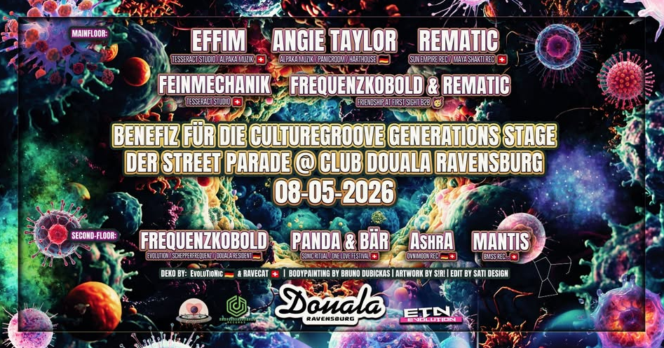 Am 8. Mai 2026 ab 22:00 Uhr verwandelt sich der Club Douala in Ravensburg in einen Ort, an dem elektronische Musik und gemeinschaftliches Engagement ineinandergreifen. Die Benefiz-Veranstaltung widmet sich der „Culturegroove Generations Stage“ der Street Parade – einem Projekt, das weit über die klassische Clubnacht hinausweist. 🎶🌌🤝