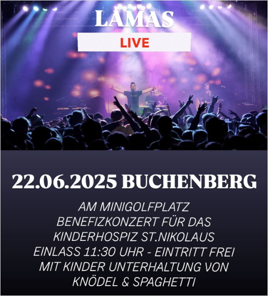 Am Sonntag, den 22. Juni 2025, laden die LAMAS zu einem besonderen Live-Auftritt nach Buchenberg: Beim Benefizkonzert mit den LAMAS in Buchenberg treten die Musiker zugunsten des Kinderhospizes St. Nikolaus auf. Die Veranstaltung beginnt am Minigolfplatz um 11:30 Uhr, der Eintritt ist frei.