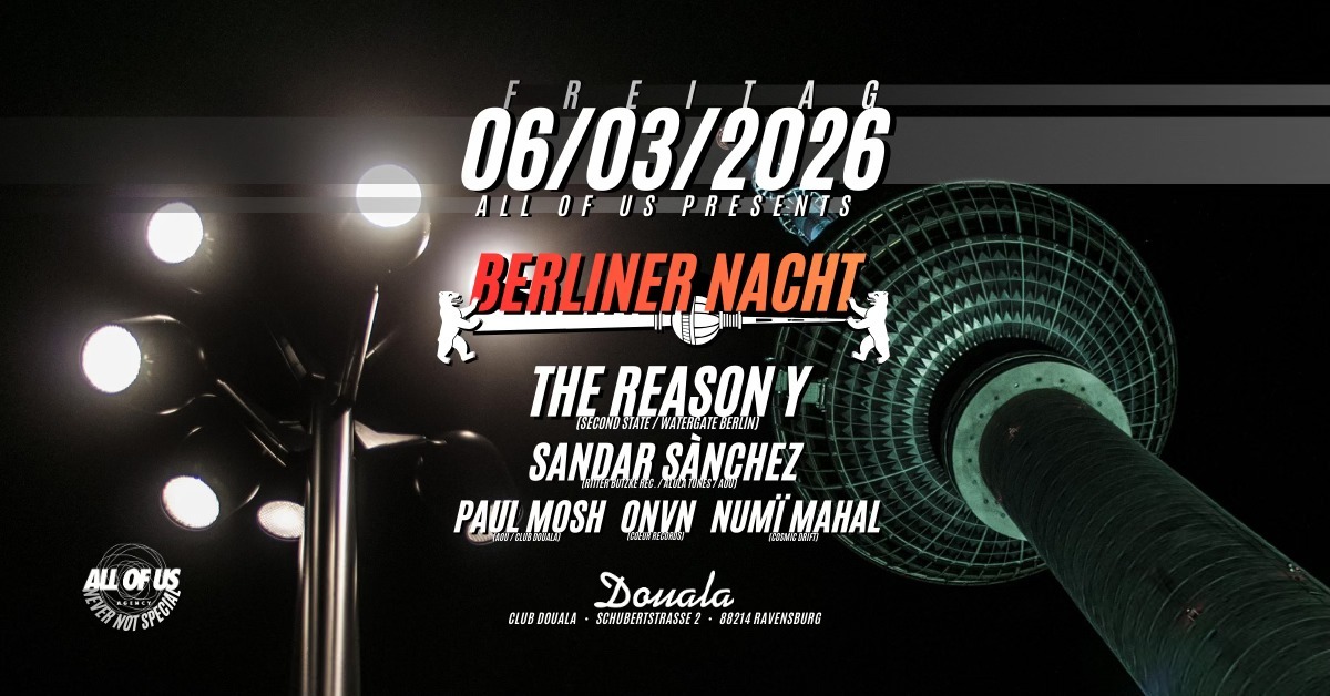 Die Berliner Nacht im Club Douala Ravensburg wird von der All Of Us Agency präsentiert und bringt am Freitag, 6. März 2026, einen klaren Fokus auf zeitgenössischen Techno und elektronische Clubkultur. Beginn der Veranstaltung ist um 22.00 Uhr, gespielt wird bis in die frühen Morgenstunden. Der Club Douala in der Schubertstraße 2 zählt zu den prägenden Orten des regionalen Nachtlebens und ist bekannt für internationale Bookings, hochwertige Soundsysteme und eine offene, tanzorientierte Atmosphäre. 🔊🌒🕺