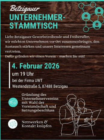 Der Betzigauer Unternehmerstammtisch bei der Firma UWT findet am 4. Februar 2026 um 19 Uhr statt. Ort des Geschehens ist die Firma UWT, Westendstraße 5, 87488 Betzigau. Eingeladen sind Betzigauer Gewerbetreibende und Freiberufler, die den Austausch untereinander stärken und ihre Interessen künftig gemeinsam vertreten möchten. Die Veranstaltung ist bewusst als persönliches Treffen angelegt und schafft Raum für Begegnung jenseits formeller Strukturen 📍🕖🏢.