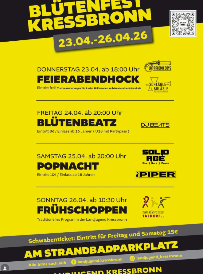 Zum Ausklang lädt das Blütenfest Kressbronn am Sonntag, 26.04.2026, ab 10:30 Uhr zum Frühschoppen ein. Das traditionelle Programm wird von der Landjugend Kressbronn gestaltet, musikalisch begleitet vom Musikverein Taldorf e.V. Der Vormittag setzt bewusst auf Blasmusik, Begegnung und einen ruhigeren Rhythmus nach zwei Partynächten. 🎺🥨