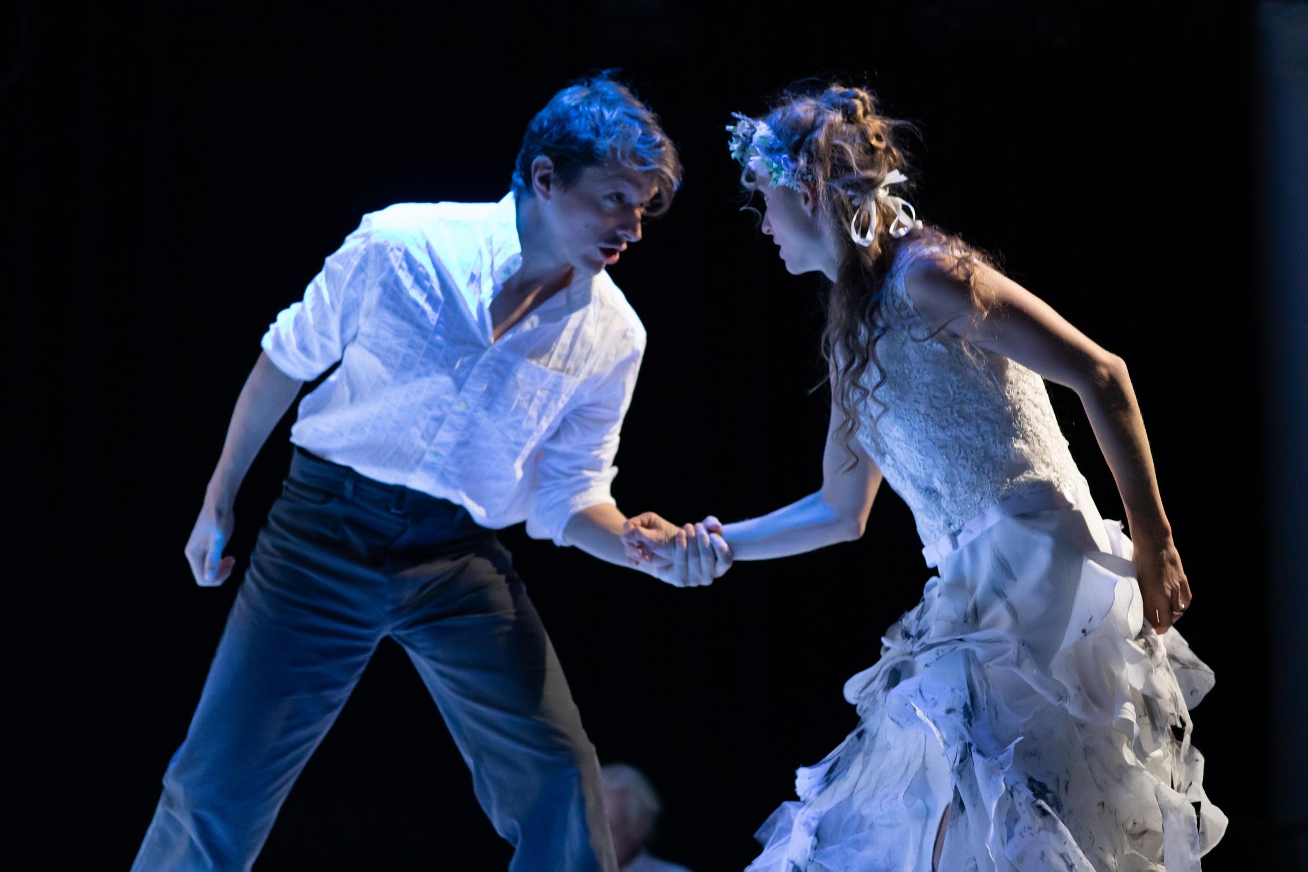 Unter der Inszenierung von Carlos Belda entfaltet sich BLUTHOCHZEIT als kraftvolles Ritual aus Musik, Körperlichkeit und poetischen Bildern. Die Musik von Murat Parlak schafft einen atmosphärischen Klangraum, der zwischen düsterer Vorahnung und lodernder Leidenschaft oszilliert. Die eindrucksvollen Kostüme von Michael S. Kraus greifen die archaische Bildwelt des Stücks auf und verbinden sie mit modern anmutender Strenge.