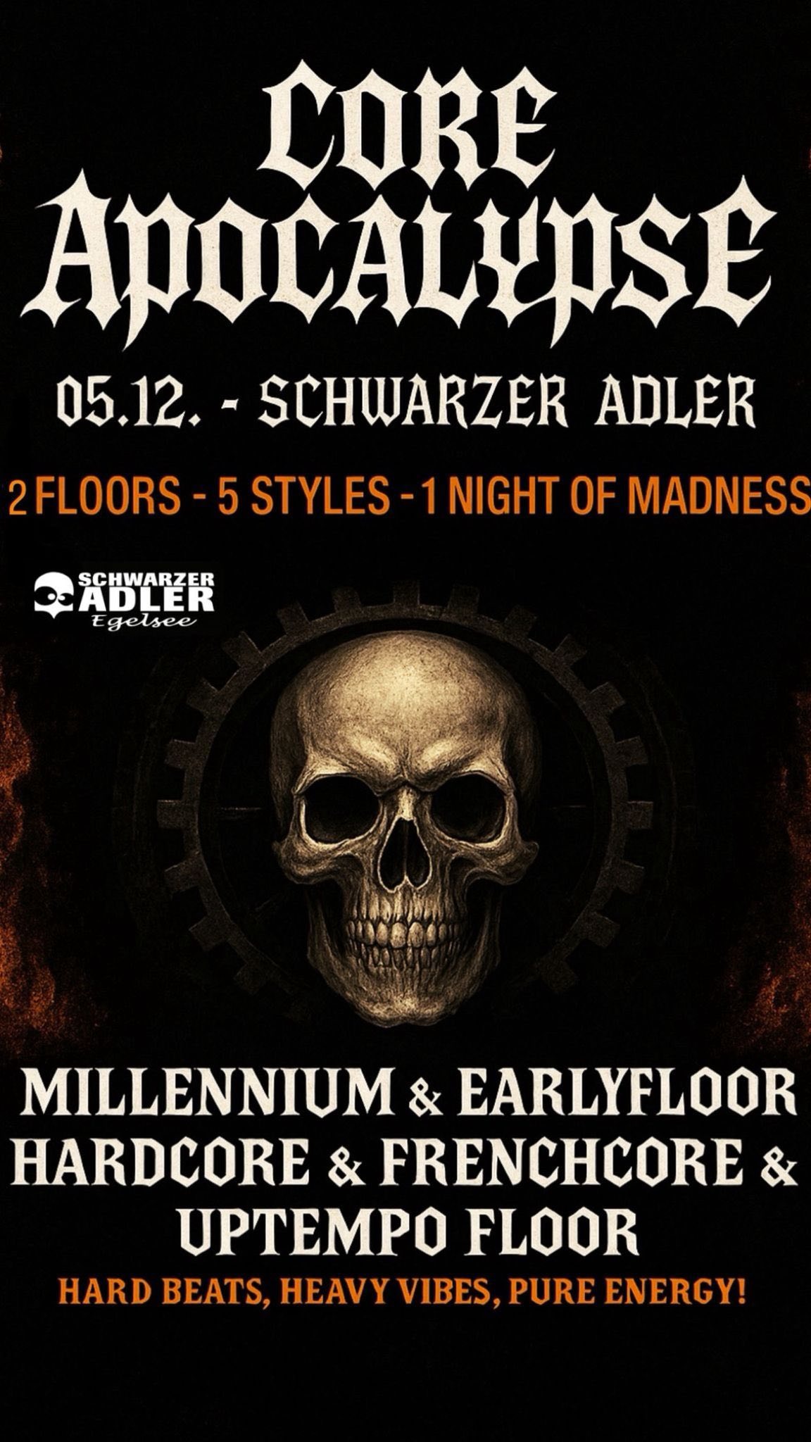 Die Veranstaltung beginnt um 22:00 Uhr und endet offiziell um 5:00 Uhr – ob das für alle das Ende sein wird, ist eine andere Frage. Denn der Core Apocalypse lebt vom kollektiven Ausbruch: vom Moment, wenn Beats und Körper verschmelzen, wenn der Floor bebt und sich alles auflöst in Rhythmus und Licht. 🌀🕺💥
