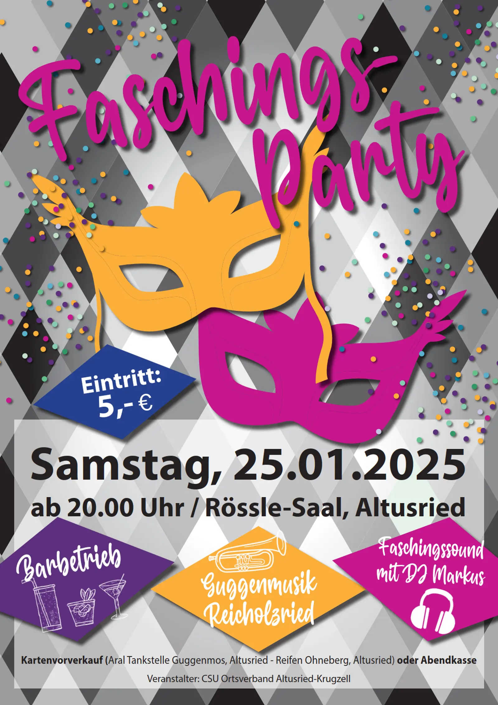Meine Damen und Herren, am Samstag, den 25. Januar 2025, wird Altusried zur Hochburg des Faschings! Der Rössle-Saal, dieser traditionsreiche Ort Altusrieder Geselligkeit, wird kochen, beben und vibrieren – denn dann steigt DIE Faschingsparty des Jahres, organisiert vom CSU-Ortsverband Altusried-Krugzell. Und lassen Sie mich eines gleich zu Beginn sagen: Das hier ist keine Party für Zögerer oder Maulfaule – das ist ein Fest für alle, die noch wissen, was echte Feierkultur bedeutet!