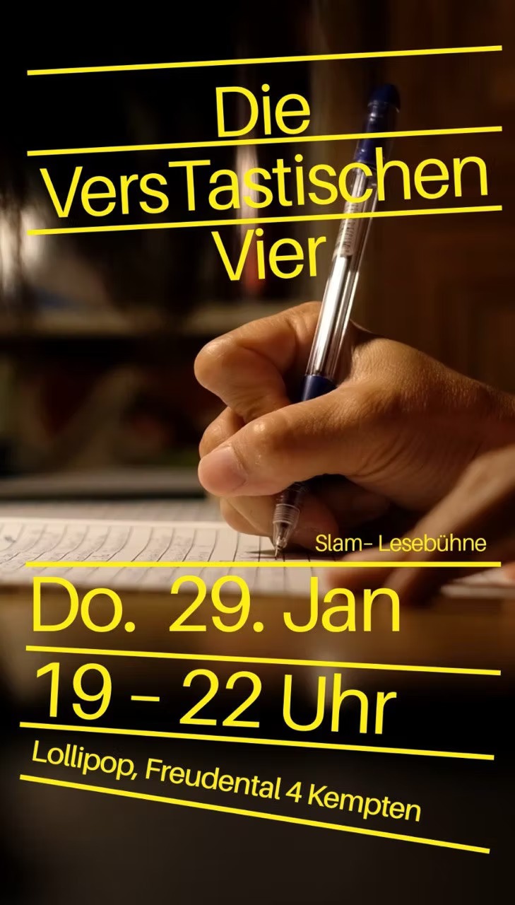 Die VersTastischen Vier im Lollipop in Kempten stehen für ein Format zwischen Lesung, Poetry Slam und Performance. Vier Autor:innen teilen sich die Bühne und bringen eigene Texte mit, die stilistisch bewusst unterschiedlich angelegt sind. Humor trifft auf Nachdenklichkeit, sprachliche Spielerei auf präzise Beobachtung. Die Slam-Lesebühne folgt keinem Wettbewerb, sondern dem gemeinsamen Interesse an Sprache und Wirkung. Texte dürfen laut sein oder leise, zugespitzt oder tastend – entscheidend ist der unmittelbare Kontakt mit dem Publikum. ✍️🎭📚
