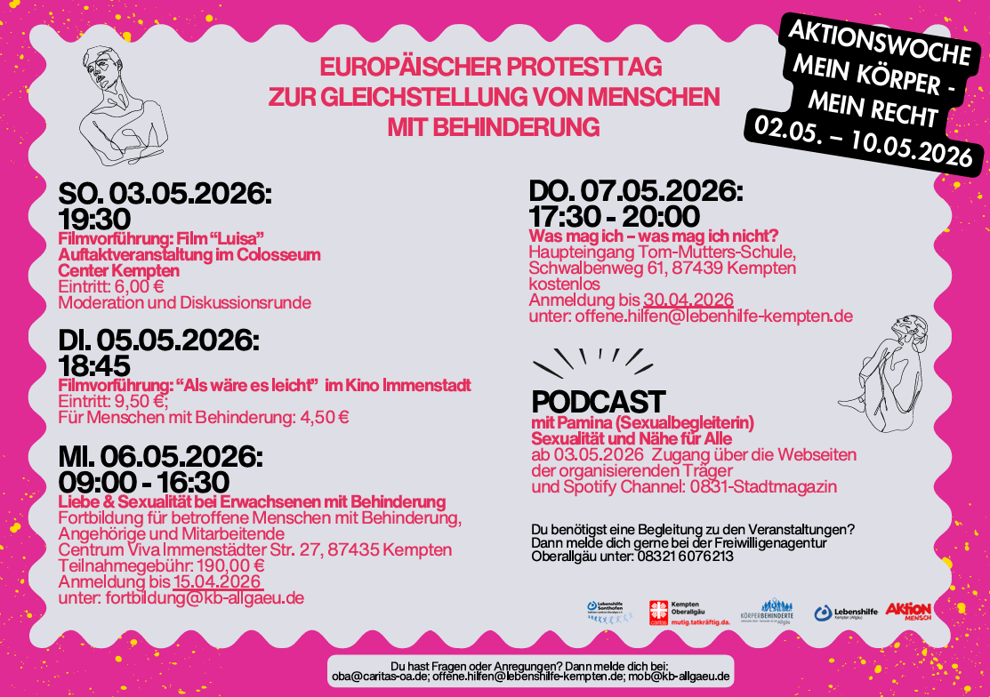 Zwischen Diskussion, Film und Austausch entfaltet sich in Kempten Anfang Mai ein Programm, das gesellschaftliche Fragen in den Mittelpunkt rückt. Vom 02. Mai bis 10. Mai 2026 steht die Aktionswoche unter dem Motto „Mein Körper – mein Recht“ und verbindet unterschiedliche Formate zu einem gemeinsamen Anliegen: der Gleichstellung von Menschen mit Behinderung. Den Auftakt bildet eine Reihe von Veranstaltungen, die informieren, sensibilisieren und Begegnung ermöglichen. 🎬🗣️♿