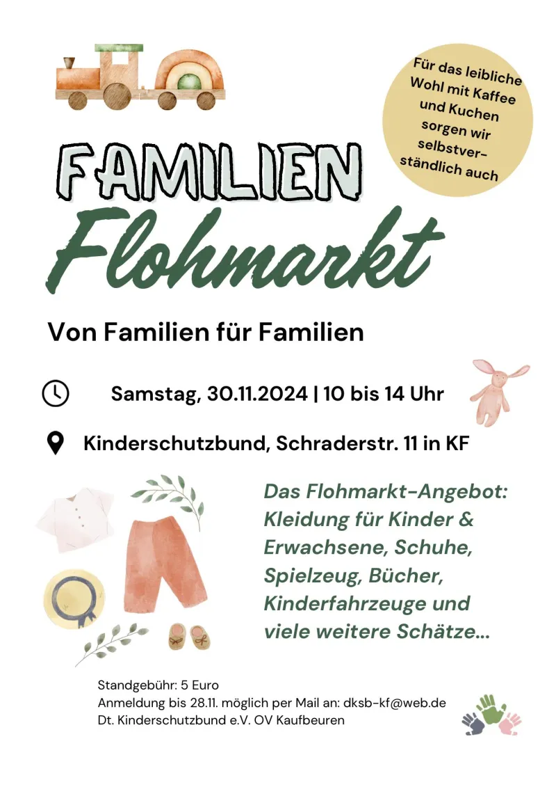 Am Samstag, den 30. November 2024, lädt der Kinderschutzbund in Kaufbeuren zum Familienflohmarkt in die Schraderstraße 11 ein. Von 10 bis 14 Uhr erwartet die Besucher eine bunte Auswahl an Kleidung für Kinder und Erwachsene, Schuhen, Spielzeug, Büchern, Kinderfahrzeugen und vielen weiteren kleinen und großen Schätzen. Hier findet sich alles, was das Familienleben erleichtert und verschönert – zu familienfreundlichen Preisen.