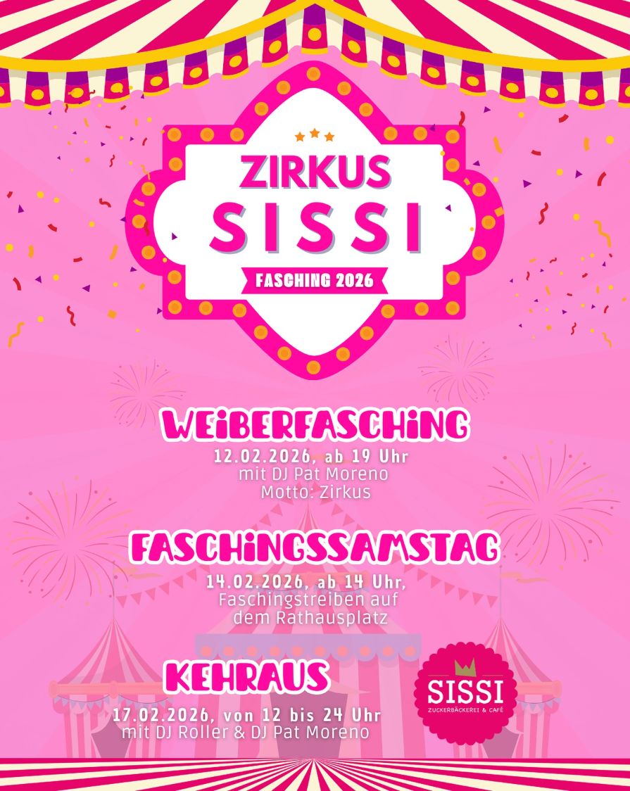 Der Zirkus Sissi spannt sich im Jahr 2026 über mehrere Programmpunkte und richtet sich an unterschiedliche Publikumsgruppen. Im Mittelpunkt steht nicht ein einzelner Abend, sondern eine Abfolge von Terminen, die den Fasching Schritt für Schritt entfalten. Ort des Geschehens ist das Umfeld der Sissi Zuckerbäckerei & Café, ergänzt durch den Rathausplatz, der zum offenen Treffpunkt wird 🎭🍬.