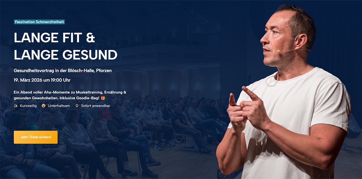 Faszination Schmerzfreiheit in der Blösch-Halle beginnt am 19. März 2026 um 19:00 Uhr, Einlass ist ab 18:30 Uhr. 📆⏰ Veranstaltungsort ist die Blösch-Halle (Flohwiese), Auf den Auen 1, 87666 Pforzen. 📍🏡 Unter dem Leitgedanken „Lange fit & lange gesund“ zeigt der Abend, wie Bewegung, Training, Ernährung, Regeneration und der Umgang mit Alltagsbelastung zusammenspielen. 🥗🏋️♂️ Dabei bleibt der Vortrag bewusst praxisnah und unmittelbar anwendbar.