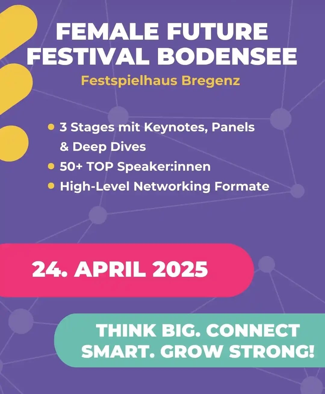 Über 50 Speaker:innen, mehr als 35 Keynotes und Panels sowie rund 1.000 Teilnehmende – das Female Future Festival im Festspielhaus Bregenz verspricht am 24. April 2025 einen Tag voller Ideen, Impulse und Begegnungen. Die Veranstaltung bringt Menschen zusammen, die sich für zukunftsgerichtetes Denken, Vielfalt und neue Formen des Zusammenarbeitens interessieren.