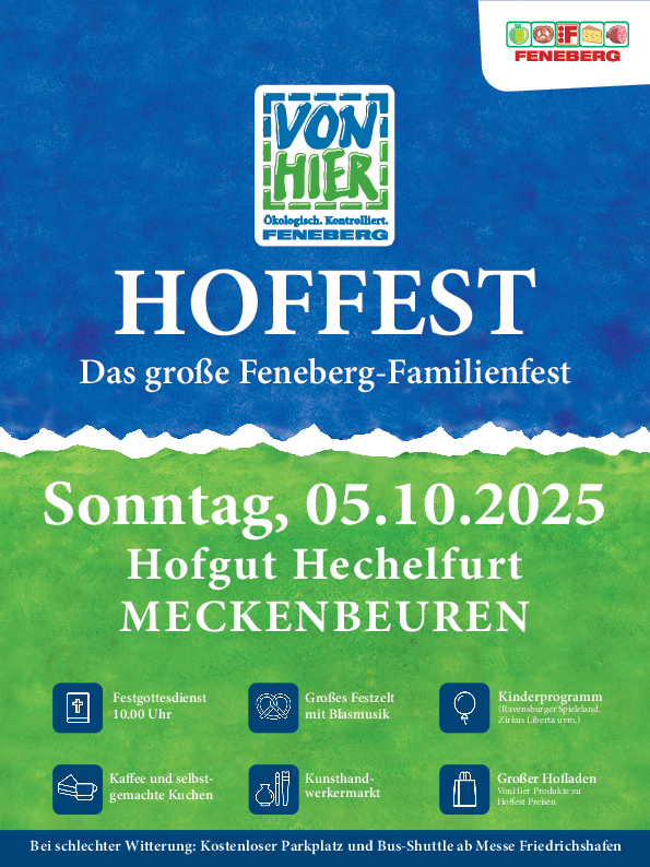 Am Sonntag, 5. Oktober 2025, verwandelt sich das Hofgut Hechelfurt in Meckenbeuren ab 10 Uhr in einen Treffpunkt für die ganze Region. Das traditionsreiche Feneberg-Hoffest lädt zum Entdecken, Genießen und Mitmachen ein – mit einem vielseitigen Programm für Familien, Genießer und alle, die sich für nachhaltige Landwirtschaft interessieren.