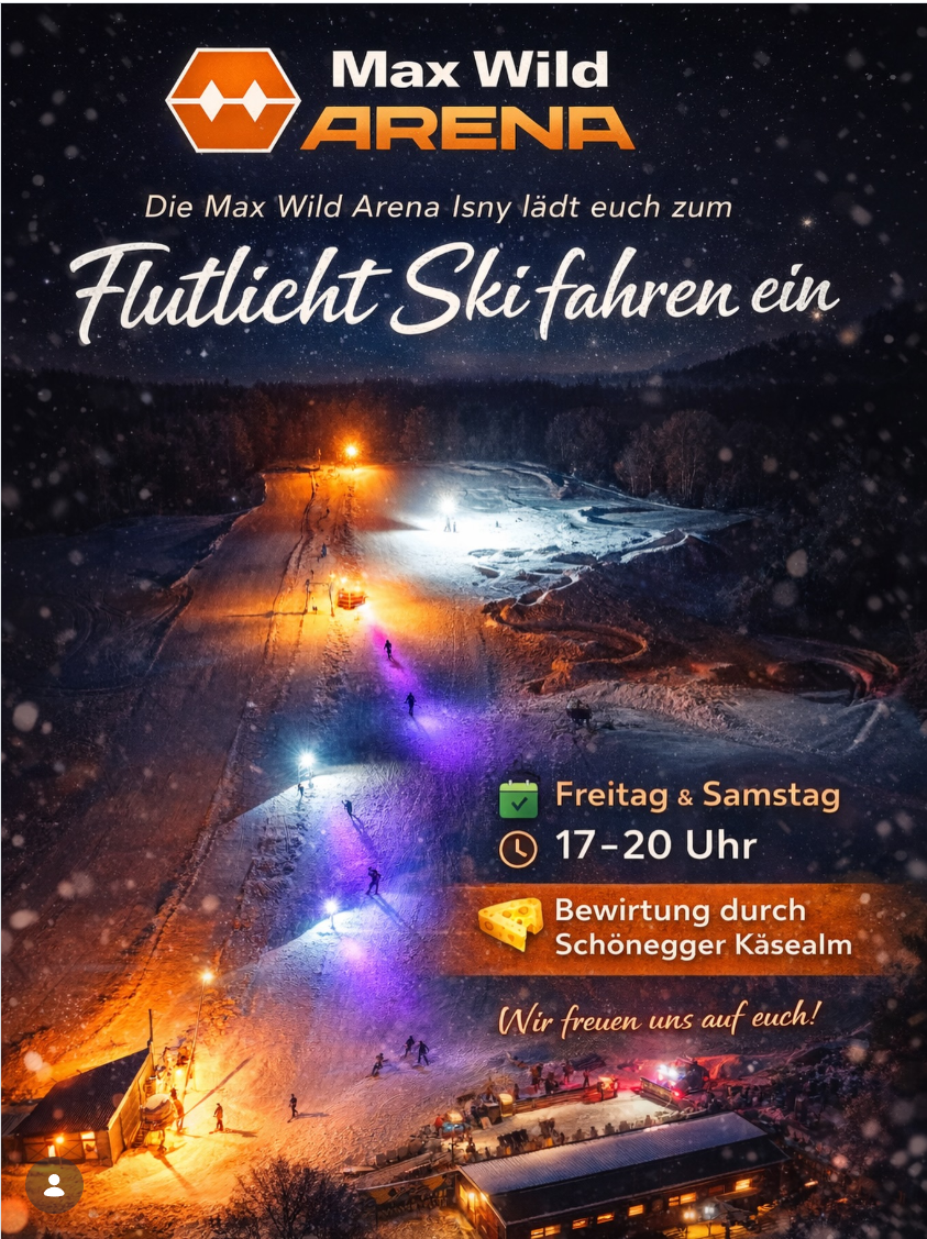 Das Flutlichtskifahren in der Max Wild Arena Isny ist als wiederkehrende Veranstaltung angelegt und bewusst offen gehalten. Es gibt kein Rahmenprogramm, keine Inszenierung im klassischen Sinn. Die Piste selbst steht im Mittelpunkt. Gerade dadurch entsteht eine entspannte Form des Wintersports, die sich klar vom Trubel größerer Skigebiete absetzt 🎿🌲.