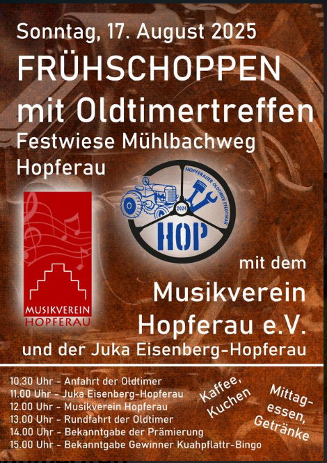 Am Sonntag, den 17. August 2025, trifft mechanische Nostalgie auf musikalische Tradition: Auf der Festwiese am Mühlbachweg in Hopferau findet ab 10:30 Uhr ein stimmungsvoller Frühschoppen mit Oldtimertreffen statt. Veranstaltet wird das gesellige Sommerereignis vom Musikverein Hopferau e.V. gemeinsam mit der Jugendkapelle Eisenberg-Hopferau.
