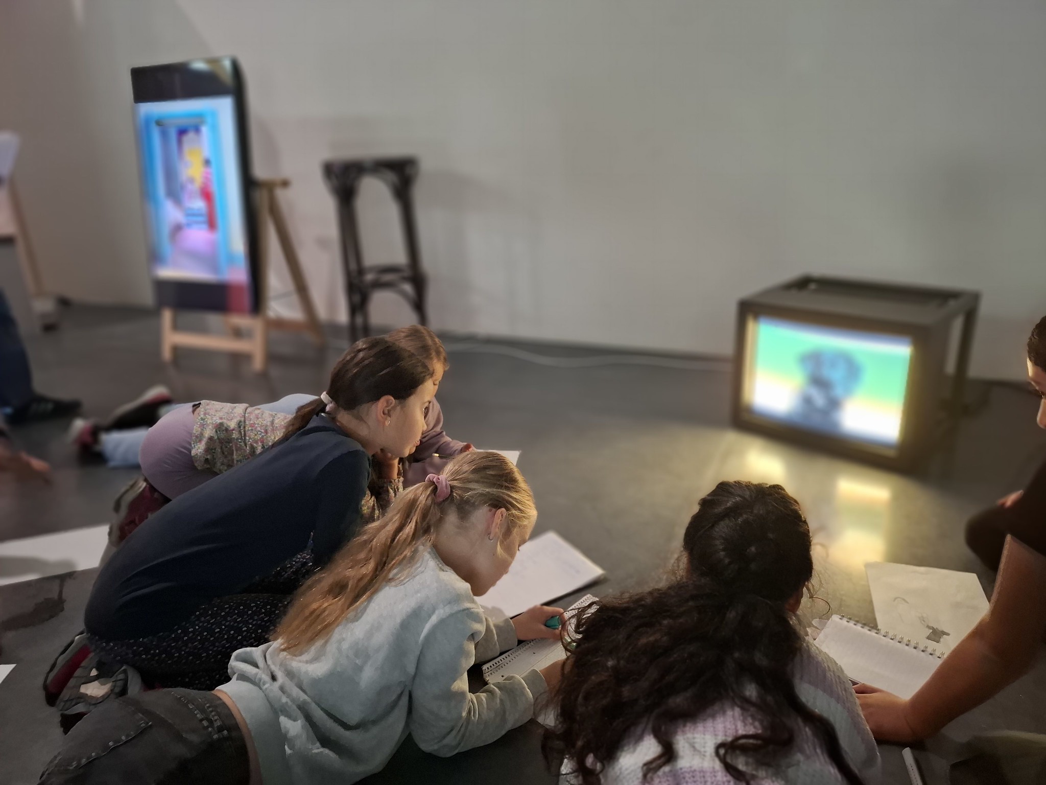 Geheime Türen und fliegende Fenster in Kaufbeuren beginnt mit einer gemeinsamen Erkundung der aktuellen Ausstellung. Dabei entdecken die Teilnehmenden überraschende Details in Bildern und Installationen – von mysteriösen Schränken bis zu geöffneten Durchgängen im Raum. Die Beobachtungen bilden den Ausgangspunkt für eigene Geschichten, die im Anschluss im Atelier zu Papier gebracht werden. ✍️🖼️