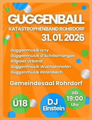 Ab 19:00 Uhr stehen gleich mehrere Formationen auf der Bühne: Guggenmusik Isny, Guggenmusik d’Schillamongos, Allgaier Urband, Guggenmusik Wuchzenhofen und Guggenmusik Rötenbach 🎷🥁. Jede Gruppe hat ihren eigenen Charme, und manchmal klingt es, als würde ein Bläsersatz mitten im Satz beschließen, in eine völlig neue Richtung zu marschieren. Genau darin liegt die Freude dieses Musikstils. Der Gemeindesaal Rohrdorf bietet dafür einen Raum, der diese Mischung aus Chaos und Rhythmus gut auffängt.
