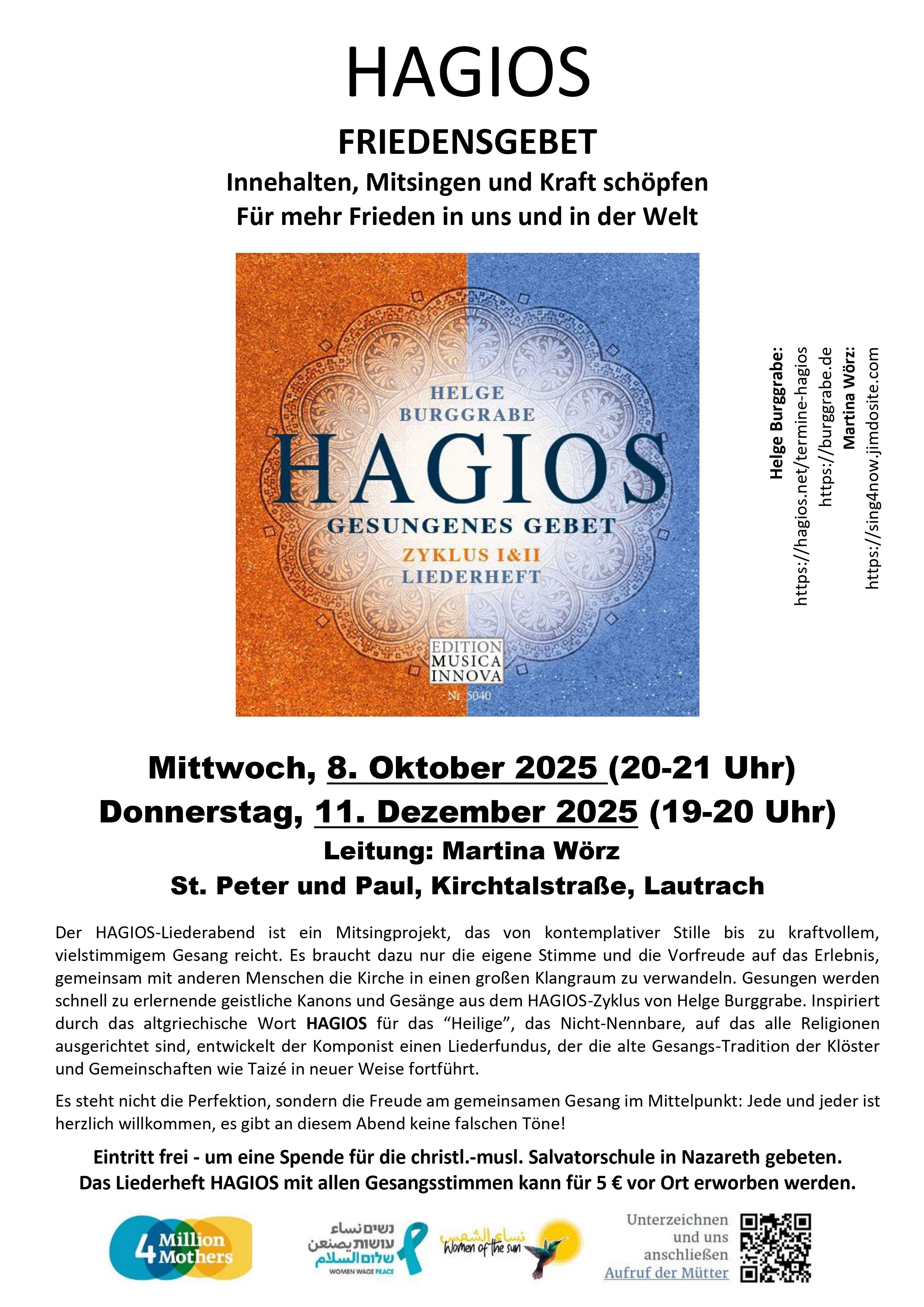 Gesungen werden schnell zu erlernende geistliche Kanons und Gesänge aus dem HAGIOS-Zyklus von Helge Burggrabe. Inspiriert durch das altgriechische Wort HAGIOS für das “Heilige”, das Nicht-Nennbare, auf das alle Religionen ausgerichtet sind, entwickelt der Komponist einen Liederfundus, der die alte Gesangs-Tradition der Klöster und Gemeinschaften wie Taizé in neuer Weise fortführt.