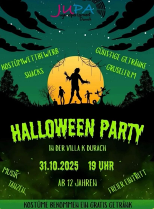 Halloween Party in der Villa K Durach – so nennt sich die Veranstaltung, die das Jugendparlament Durach am Abend des 31. Oktober ausrichtet. Los geht’s um 19 Uhr, eingeladen sind alle ab 12 Jahren. Der Eintritt ist frei, die Atmosphäre offen – für neue Gesichter, kreative Kostüme und jede Menge Bewegung auf der Tanzfläche. Musik zieht durch die Räume, ergänzt von stimmungsvoller Dekoration und einem Gruselfilm, der den klassischen Halloween-Spirit aufgreift 🎬🧟♂️.