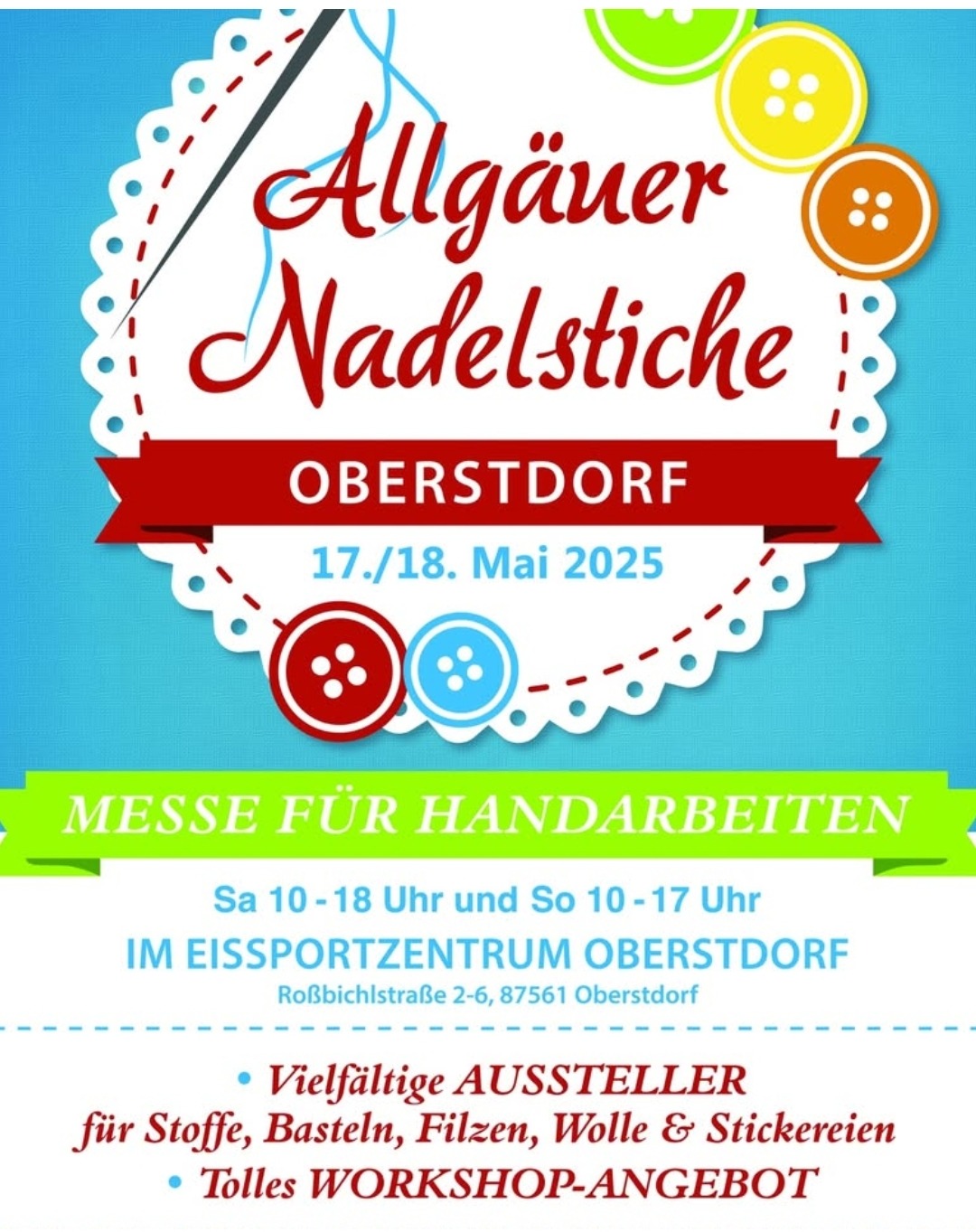 Allgäuer Nadelstiche im Eissportzentrum Oberstdorf finden 2025 zum achten Mal statt und haben sich als feste Größe im Veranstaltungskalender für Textilkunst und Handarbeit etabliert. Ob Nähen, Stricken, Filzen, Sticken oder Patchwork – die Messe bietet Materialien in großer Auswahl: Trachtenstoffe, Filzwolle, Kurzwaren, Knöpfe und vieles mehr stehen bereit. Ergänzt wird das Sortiment durch ein umfangreiches Workshop-Programm sowie ein Nähcafé, das mit Kaffee, Kuchen und Brotzeit für entspannte Pausen sorgt. Eine Tombola rundet das Messeerlebnis ab.