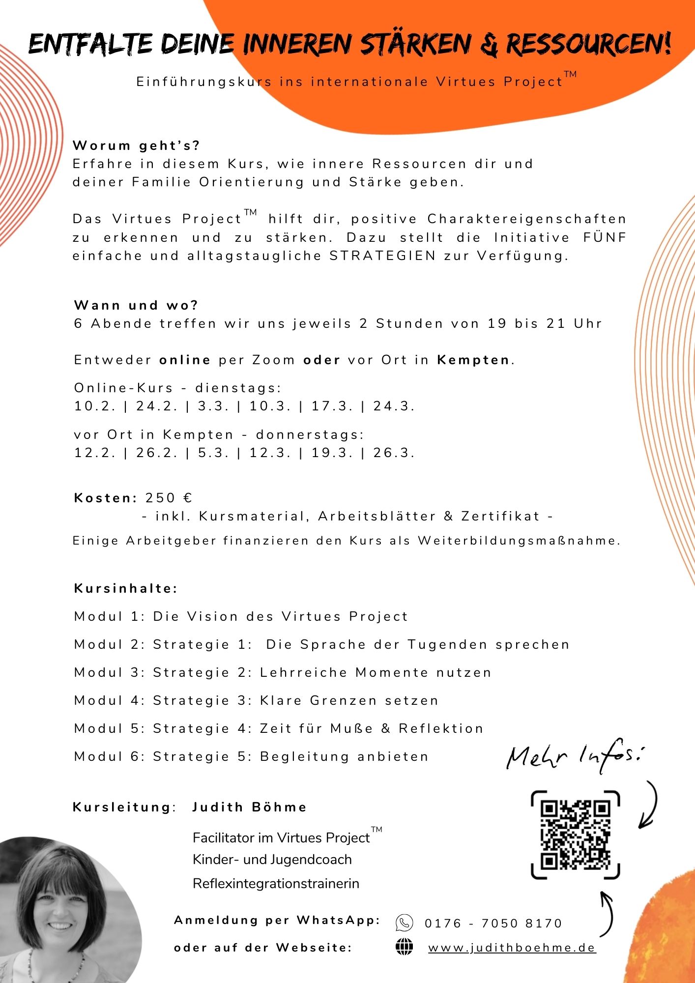 Geleitet wird der Kurs von Judith Böhme, zertifizierte Facilitatorin im Virtues Project™, Kinder- und Jugendcoach sowie Reflexintegrationstrainerin. Ihre Arbeit verbindet fachliche Klarheit mit einem ressourcenorientierten Blick auf Menschen und Beziehungen 👩🏫✨.