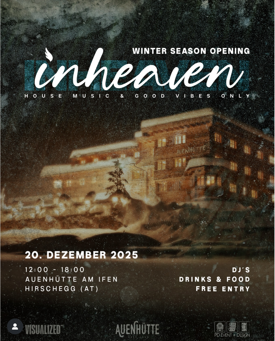 inheaven Winter Season Opening an der Auenhütte in Hirschegg ist keine Massenveranstaltung – sondern ein konzentrierter, tageslichtdurchfluteter Musikmoment im Gebirge. Für alle, die den Winter feiern wollen – aber anders. 🌨️🕺🏽🍷🎧🗻🔥🎵🌬️🍾🎿