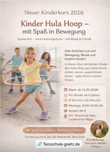 Bewegung, Musik und jede Menge Spaß stehen im Mittelpunkt des neuen Hula-Hoop-Kinderkurses 2026 der Tanzschule Götz in Leutkirch. Spielerisch, kreativ und ganz ohne Leistungsdruck entdecken Kinder hier die Welt des Hula Hoops und erleben, wie viel Freude Bewegung machen kann. Der Kurs richtet sich an Kids & Teens ab 6 Jahren, die Lust haben, sich zur Musik zu bewegen, Neues auszuprobieren und gemeinsam aktiv zu sein.