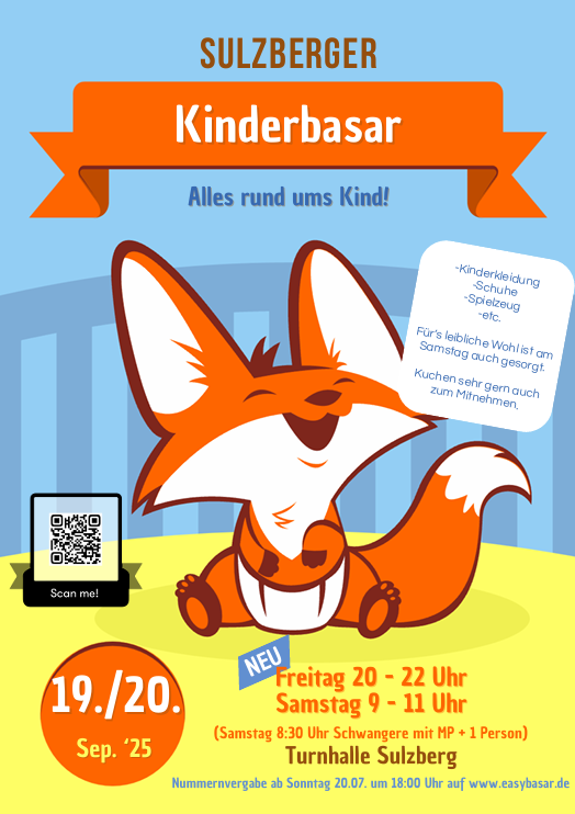 Gut sortiert, familienfreundlich und mit vielen liebevollen Details: Beim Kinderbasar in der Turnhalle Sulzberg dreht sich am 19. und 20. September alles um Kleidung, Ausstattung und Spielzeug fürs Kind. Neu in diesem Jahr ist der Abendverkauf am Freitag – von 20:00 bis 22:00 Uhr ist der Basar für alle geöffnet. Am Samstag kann wie gewohnt zwischen 09:00 und 11:00 Uhr eingekauft werden.