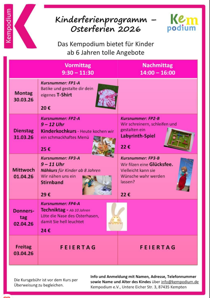 Der Freitag, 3. April, bleibt im Programm bewusst frei, da es sich um einen Feiertag handelt. Damit endet das Kinderferienprogramm im Kempodium Kempten nach vier abwechslungsreichen Kurstagen. Die Angebote werden in kleinen Gruppen durchgeführt, sodass jedes Kind genügend Raum zum Ausprobieren und Gestalten erhält. Die Kurse richten sich an Kinder ab sechs Jahren und bieten unterschiedliche Schwierigkeitsgrade je nach Alter und Thema. 👧👦🎨