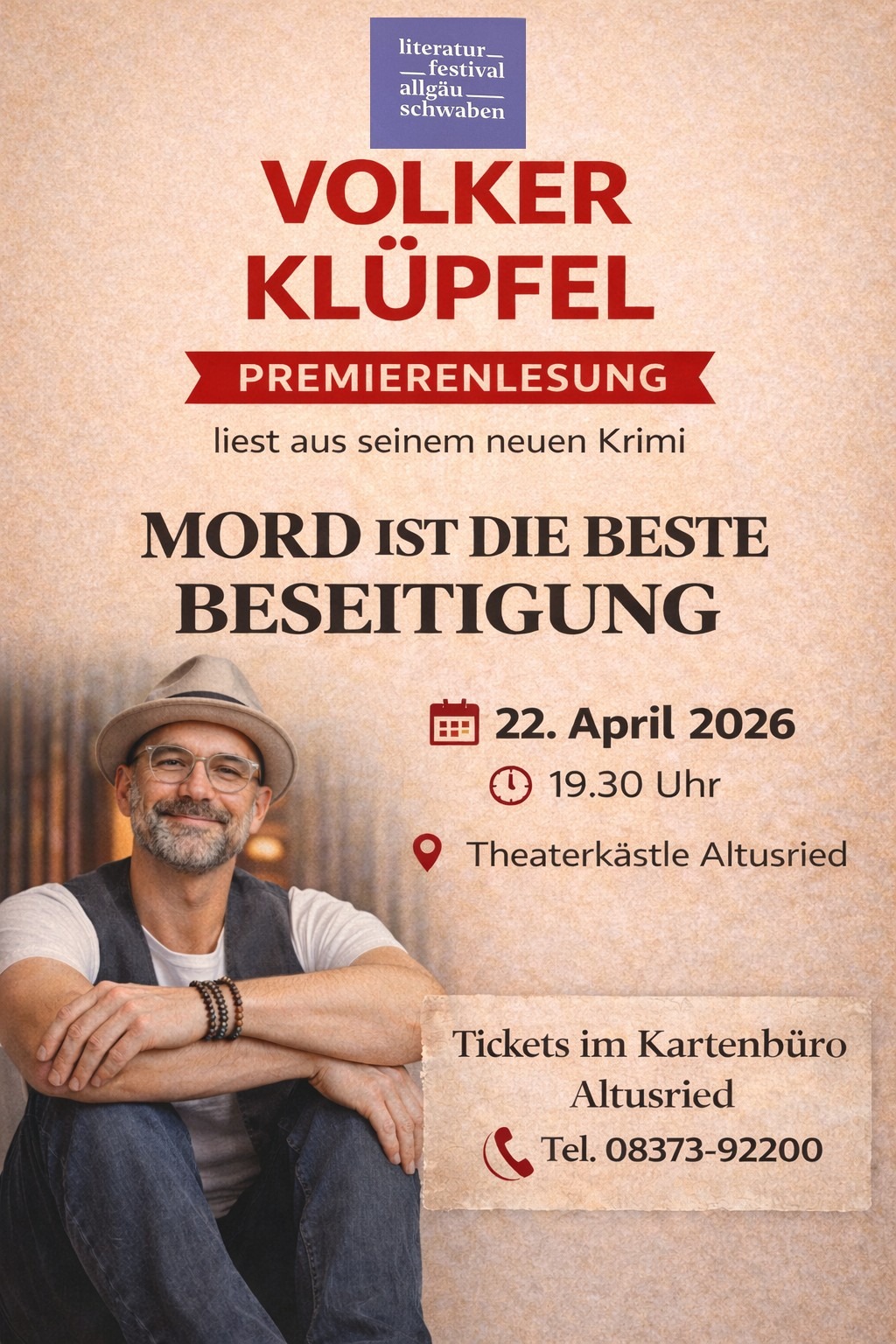 Ein Reiseruf im Radio, ein blauer Audi auf dem Weg Richtung Süden – und zwei Menschen, die nicht wegsehen können 🚗📻. Mit der Premierenlesung „Mord ist die beste Beseitigung“ im Theaterkästle Altusried präsentiert Volker Klüpfel seinen neuen Solo-Krimi erstmals dem Publikum. Am 22. April 2026 liest der in Altusried geborene Autor aus seinem aktuellen Roman und gibt Einblicke in die Fortsetzung seiner Reihe um Tommi und Svetlana.