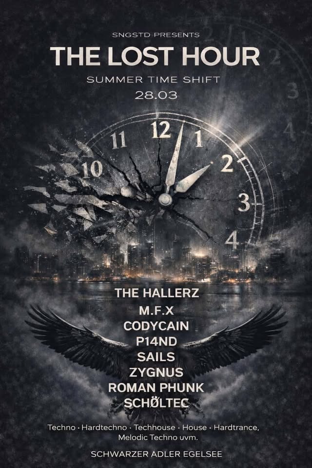 Die The Lost Hour im Schwarzen Adler Egelsee beginnt am Samstag, den 28. März 2026, um 21:00 Uhr und läuft bis in die frühen Morgenstunden um 05:00 Uhr. 📅🕘 In diesen Stunden entfaltet sich eine Veranstaltung, die den Wechsel zur Sommerzeit nicht nur begleitet, sondern bewusst ins Zentrum stellt – als spürbaren Einschnitt im Ablauf der Nacht.