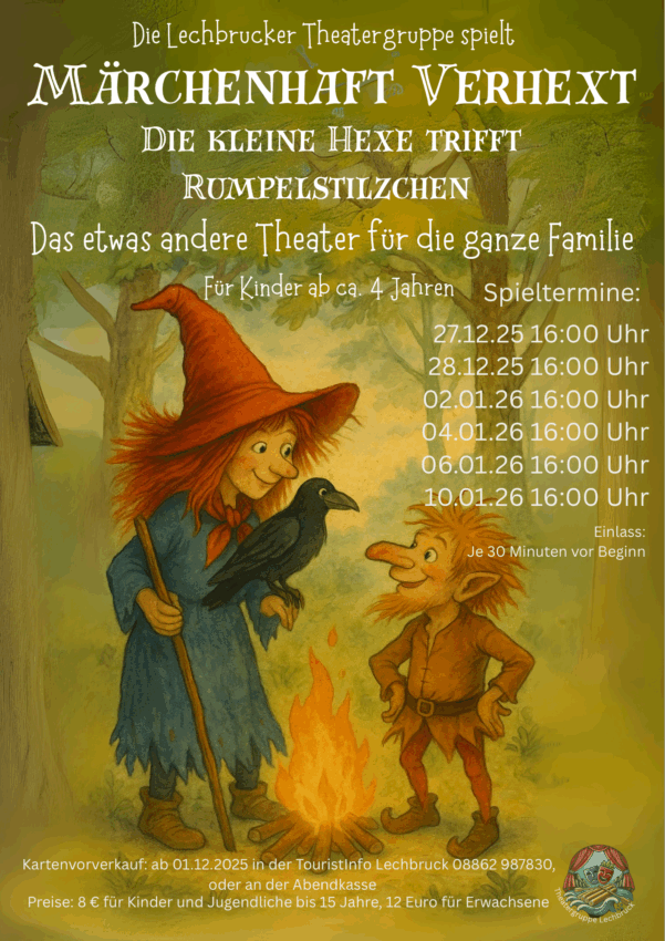 Wenn eine kleine Hexe auf Rumpelstilzchen trifft, wird die Märchenwelt neu erzählt – lebendig, charmant und mit einem Augenzwinkern. Die Lechbrucker Theatergruppe präsentiert mit Märchenhaft verhext in der Lechhalle in Lechbruck ein fantasievolles Familienstück für Kinder ab etwa vier Jahren. Insgesamt stehen sechs Aufführungstermine zwischen dem 27. Dezember 2025 und dem 10. Januar 2026 auf dem Programm. 🎭✨🧙♀️