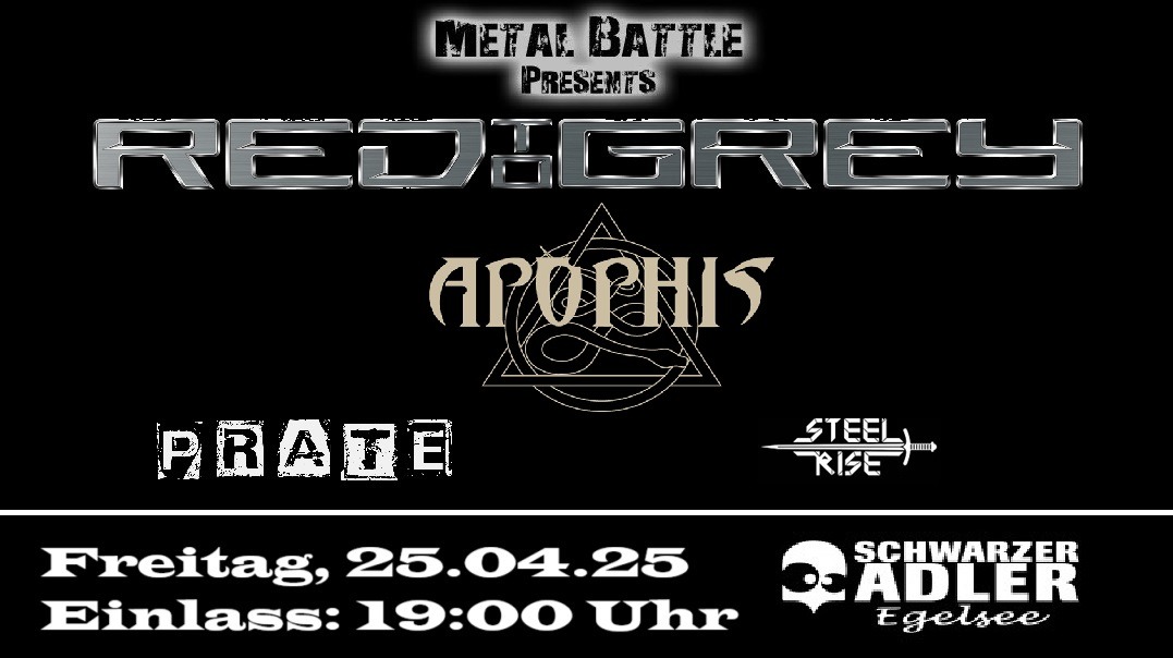 Am 25. April 2025 kehrt das Metal Battle in den Schwarzen Adler Egelsee zurück – laut, kompromisslos und hochkarätig besetzt. Headliner des Abends sind die süddeutschen Thrash-Veteranen Red To Grey und die Death-Metal-Formation Apophis aus Aalen. Support kommt von den lokalen Größen Prate (Groove/Thrash Metal, Memmingen) und Steelrise (Rock/Metal, Illertal).