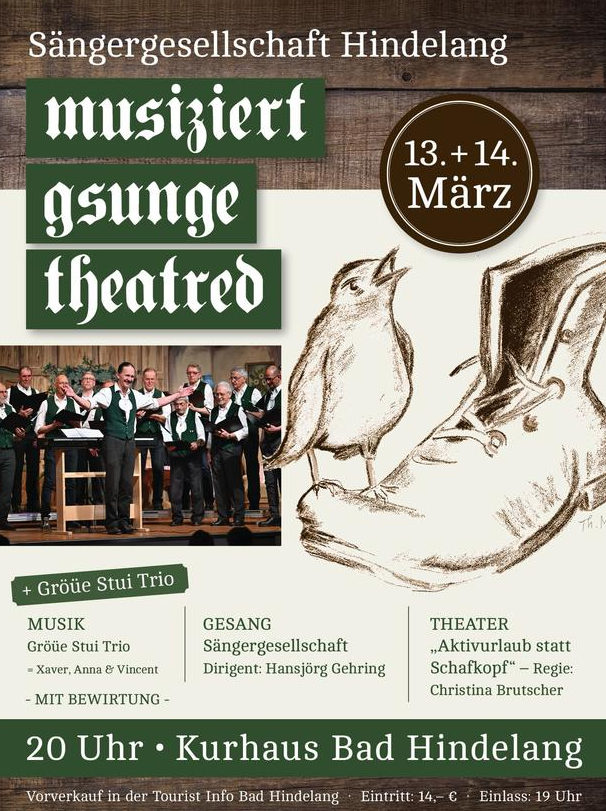 Musiziert, gsunge und theatred im Kurhaus Bad Hindelang findet am Freitag, 13. März 2026, um 20:00 Uhr sowie am Samstag, 14. März 2026, um 20:00 Uhr im Kurhaus Bad Hindelang, Unterer Buigenweg 2, 87541 Bad Hindelang statt 📍. Einlass ist jeweils ab 19:00 Uhr. Veranstalter ist die Sängergesellschaft Bad Hindelang e.V., deren Männerchor seit 1861 besteht. Gegründet wurde er einst zum Singen und Theaterspielen – und um die Geselligkeit zu pflegen. Diese Verbindung prägt den Abend bis heute 🎼.