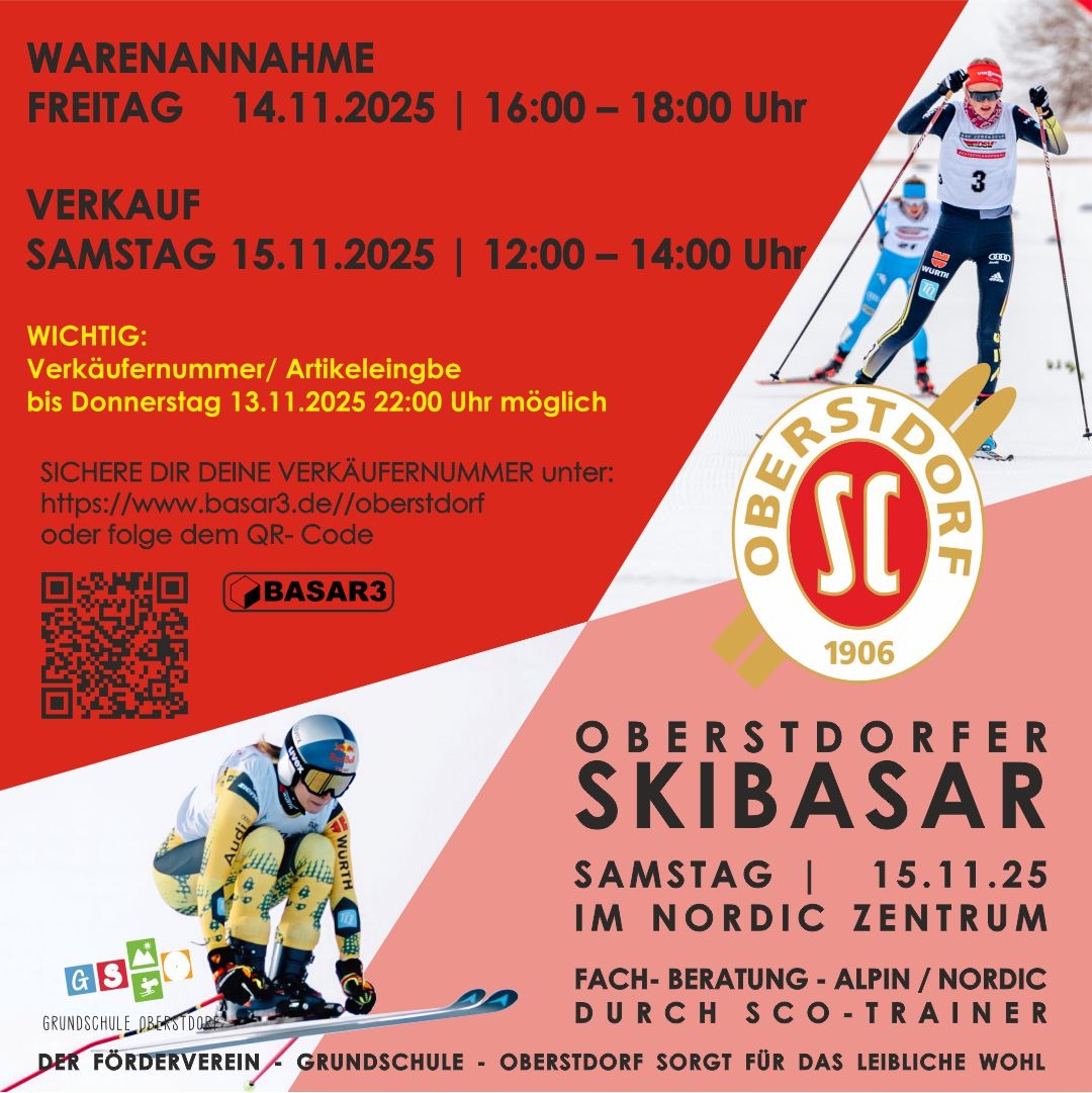 Der Oberstdorfer Skibasar im Nordic Zentrum wird von SCO-Trainerinnen und -Trainern fachlich begleitet und bietet eine vielfältige Auswahl an Ausrüstung – von Langlaufski über Alpinski bis hin zu passender Kleidung. Die Annahme der Artikel erfolgt bereits am Freitag, den 14. November, von 16:00 bis 18:00 Uhr. Voraussetzung für den Verkauf ist eine vorherige Registrierung über das Portal BASAR3 – die Eingabe muss bis spätestens Donnerstag, 13.11., um 22:00 Uhr abgeschlossen sein.