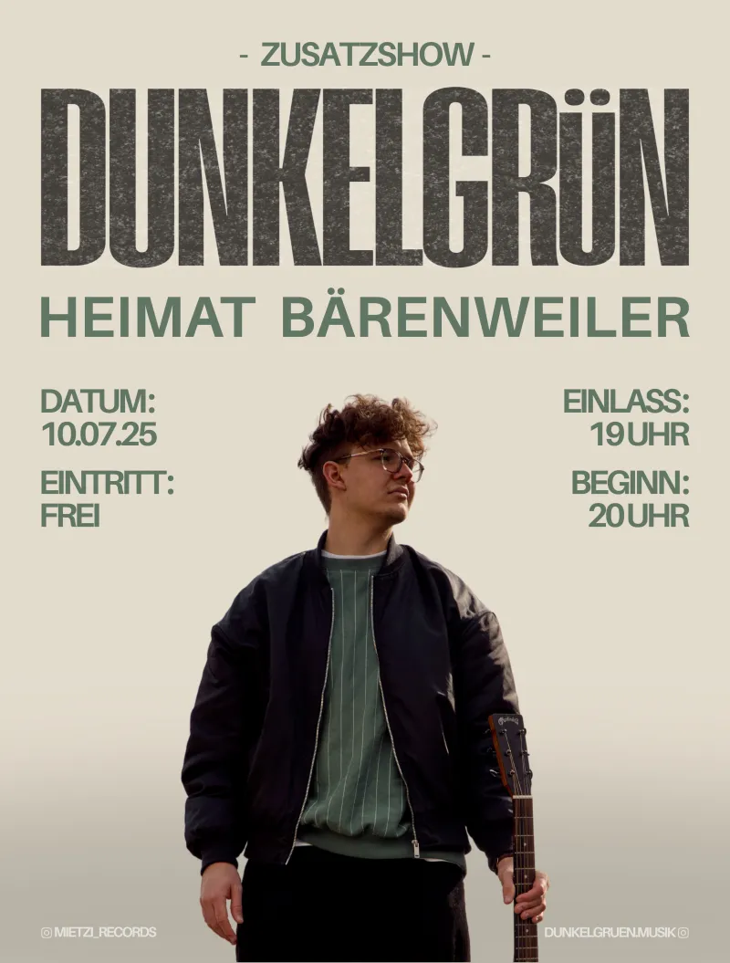 Dunkelgrün Zusatzkonzert in der Heimat Bärenweiler verspricht einen Konzertabend ohne überladenes Konzept, aber mit klarer musikalischer Haltung. In seiner aktuellen Formation verbindet Dunkelgrün melancholisch-luftige Indie-Pop-Cover mit tiefen, persönlichen Momenten. Der Sound bleibt reduziert, die Aussage direkt: „Alles endet, aber nie die Musik.“