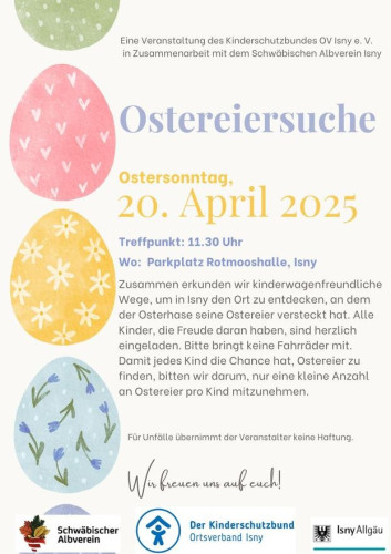 Am 20. April 2025, dem Ostersonntag, lädt der Kinderschutzbund OV Isny e. V. gemeinsam mit dem Schwäbischen Albverein Isny zu einer fröhlichen und kinderfreundlichen Ostereiersuche ein. Treffpunkt ist um 11:30 Uhr am Parkplatz der Rotmooshalle in Isny im Allgäu.