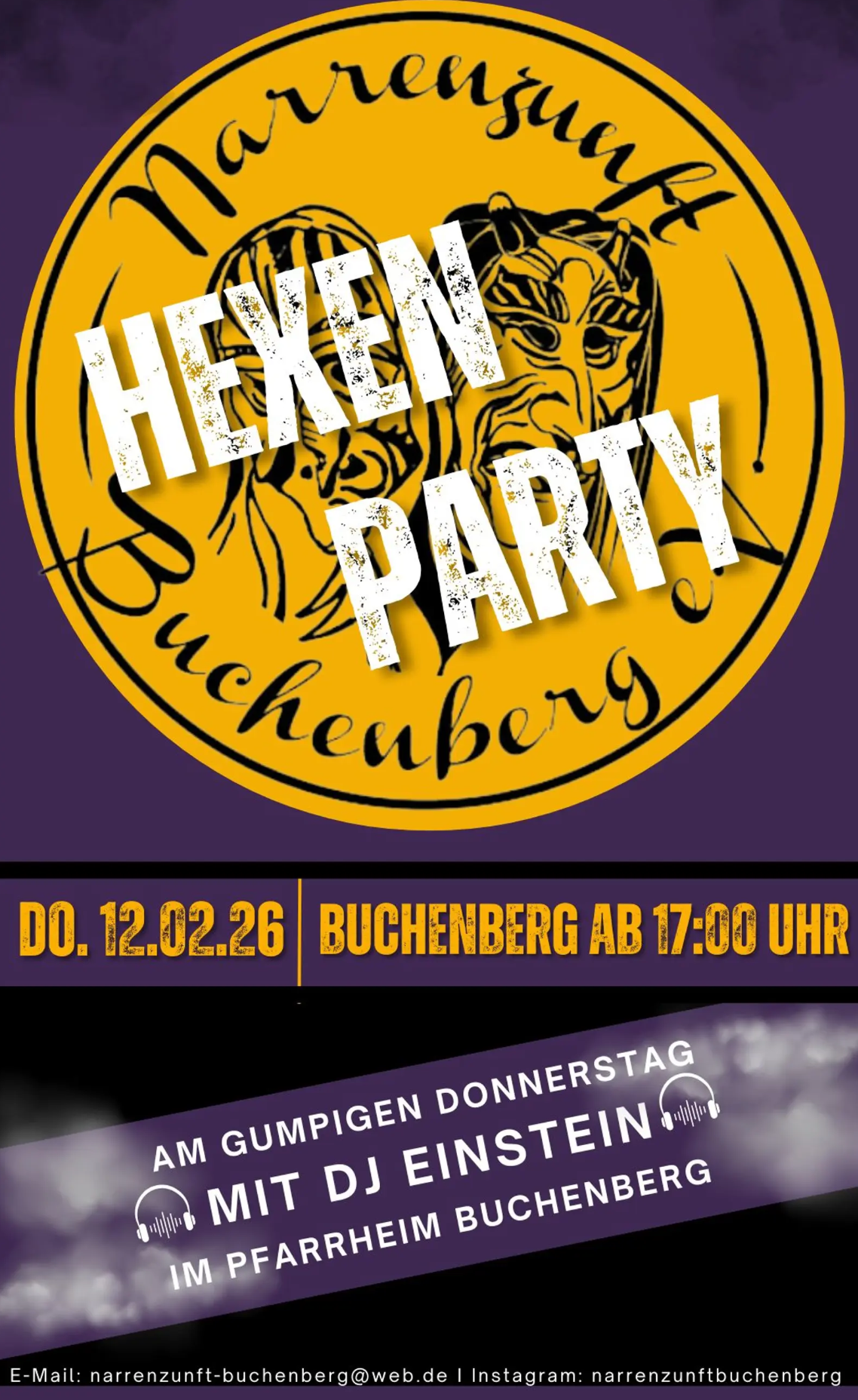 Ab dem späten Nachmittag verlagert sich das Geschehen. Ab 17:00 Uhr öffnet das Pfarrheim Buchenberg seine Türen zur Hexenparty. Der Eintritt ist frei, die Atmosphäre offen. Wer vom Umzug kommt, bleibt, wer später dazustößt, ist ebenso Teil des Abends. Der Fasching wechselt damit vom Straßenraum in den Saal, ohne an Energie zu verlieren 🎉🖤.