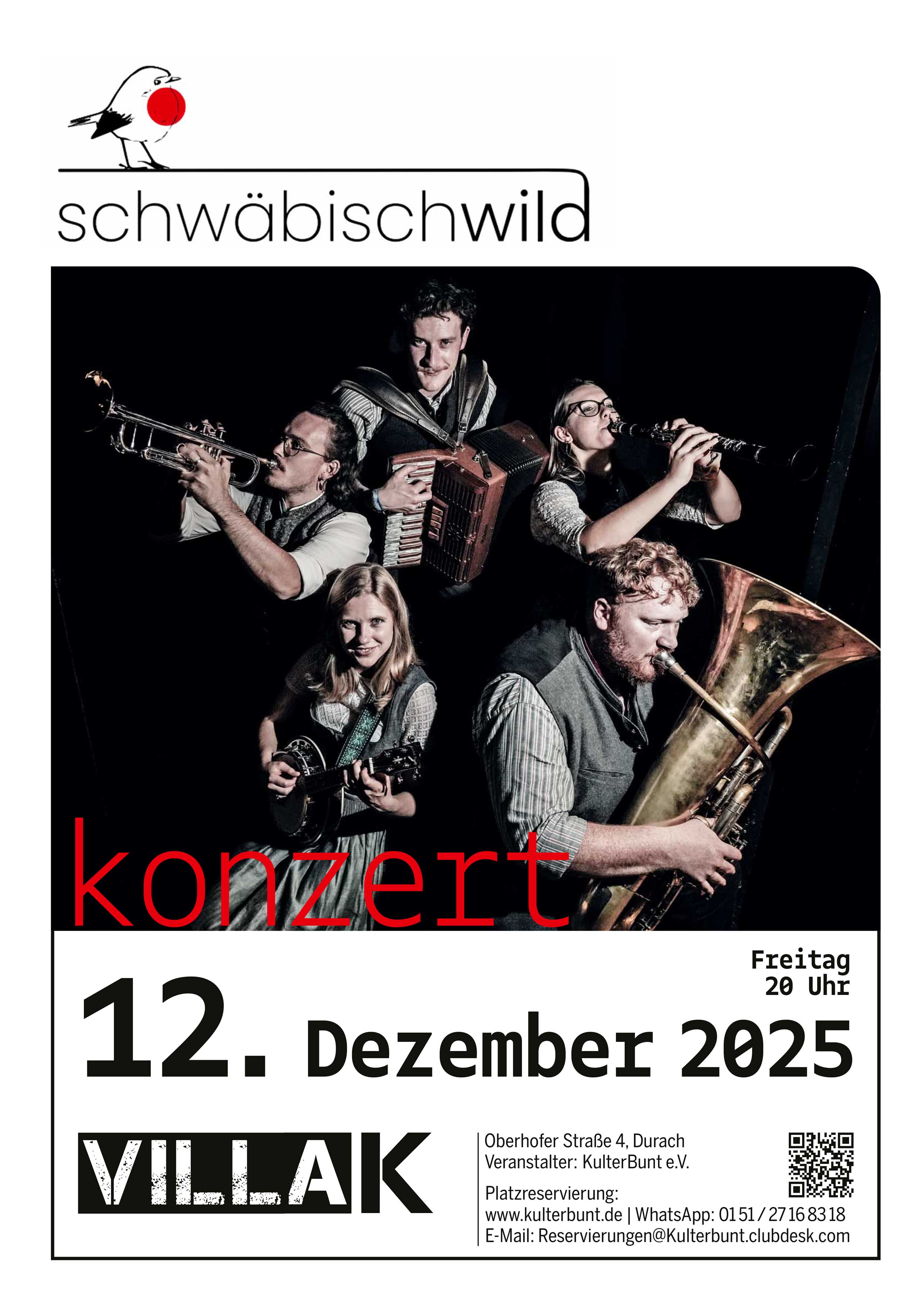 Volksmusik trifft auf Weltoffenheit: Am Freitag, den 12. Dezember 2025, wird die Villa K in Durach zur Bühne für ein Konzert, das traditionelle Klänge mit neuem Leben füllt. Schwäbischwild – fünf junge Musiker:innen aus Bayerisch-Schwaben – zeigen, wie vielseitig und lebendig Volksmusik heute klingen kann. Konzertbeginn ist um 20:00 Uhr, das Ende ist gegen 22:00 Uhr angesetzt.