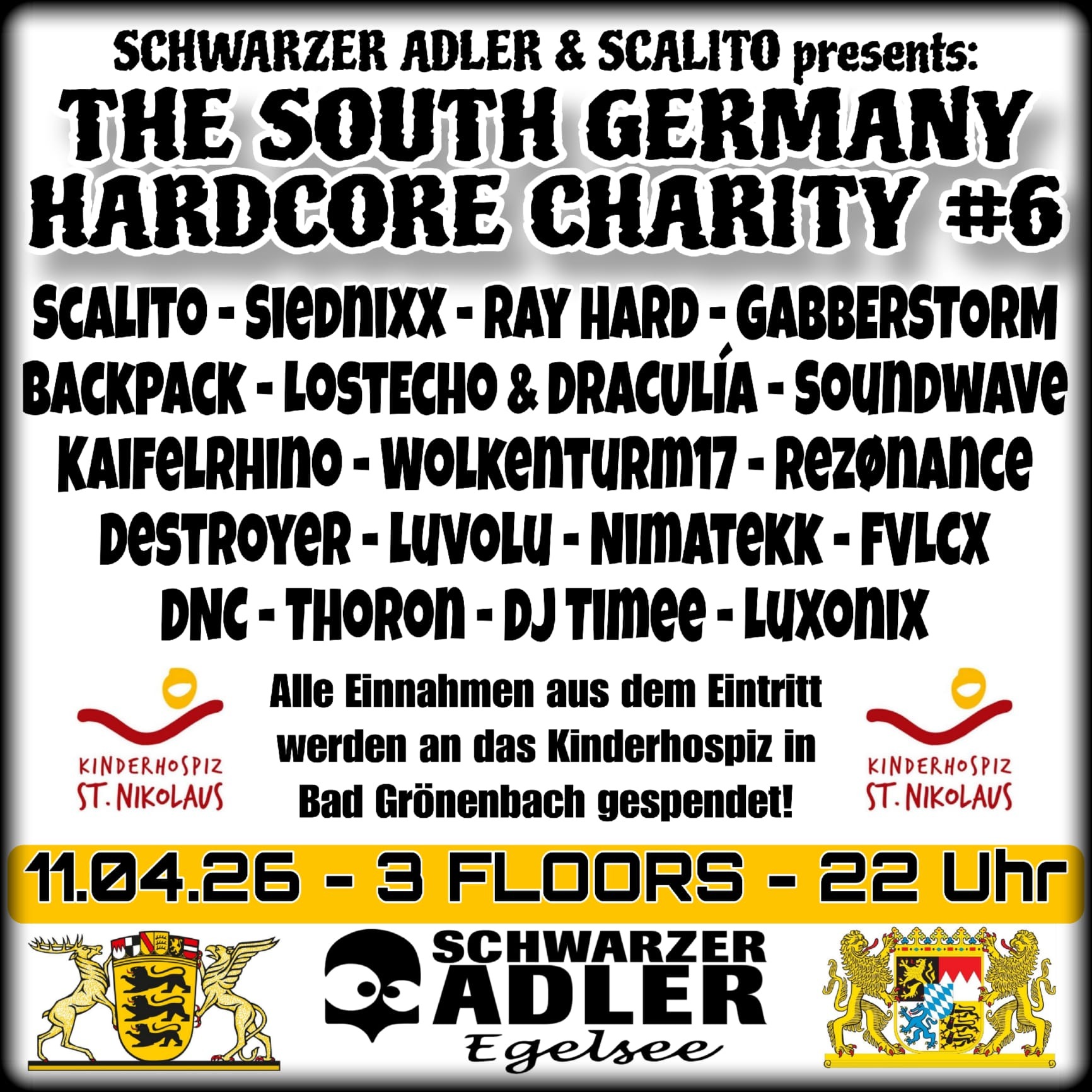 Die South Germany Hardcore im Schwarzer Adler Egelsee findet am Samstag, 11. April 2026, von 22:00 bis 05:00 Uhr statt. Über sieben Stunden hinweg bespielen zahlreiche Acts die Floors des Schwarzer Adler Egelsee, der sich für diese Nacht in einen Treffpunkt für Harder Styles, Schranz und Hardtechno verwandelt. Drei Floors strukturieren die Veranstaltung und schaffen Raum für unterschiedliche Klangfacetten innerhalb der Szene. 🎧⚡